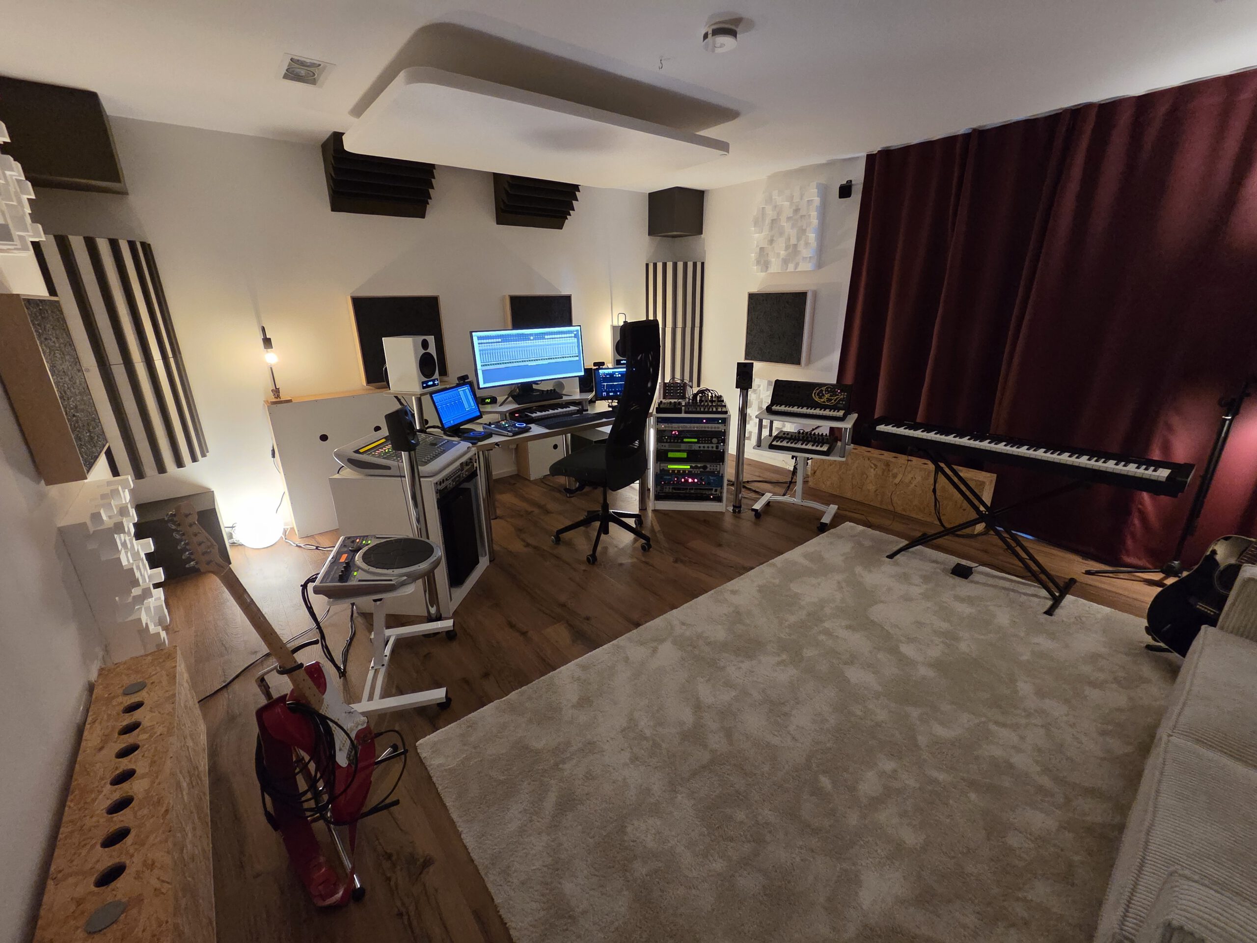 Mein Projektstudio ist vollständig akustisch optimiert und eingemessen und genügt professionellen Ansprüchen, die einem Regieraum in nichts nachstehen. Abweichungen in Pegel und Nachhallzeit wurden über das gesamte Frequenzband korrigiert, so dass stets eine neutrale Abhörsituation gegeben ist. Somit ist es ideal geeignet für sämtliche Produktionsaufgaben und auch hochwertiges Mastering. Ich nutze ProTools als DAW, verfüge über eine Vielzahl von exzellenten Audiosuiten wie beispielsweise NI Komplete Ultimate, Waves Diamond, AIR Complete, IK Multimedia, Melodyne Studio und viele weitere Werkzeuge für die vollumfängliche Musikproduktion und das Mastering. Zudem finden viele bekannte Hardware-Synthesizer, Sampler und verschiedene Hardware-Tools in meinen Produktionen Verwendung.